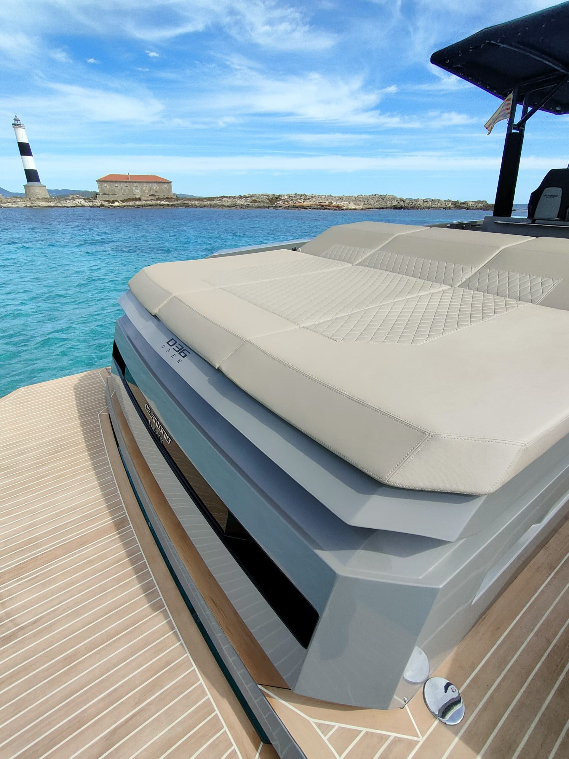 El D36 Open ALEGRÍA es sinónimo de energía, diseño contemporáneo y confort. Diseñado para quienes buscan disfrutar del mar sin comprometer estilo ni rendimiento, este modelo se mueve con agilidad gracias a sus dos motores de 300 hp y su eficiente casco que alcanza hasta 44 nudos.