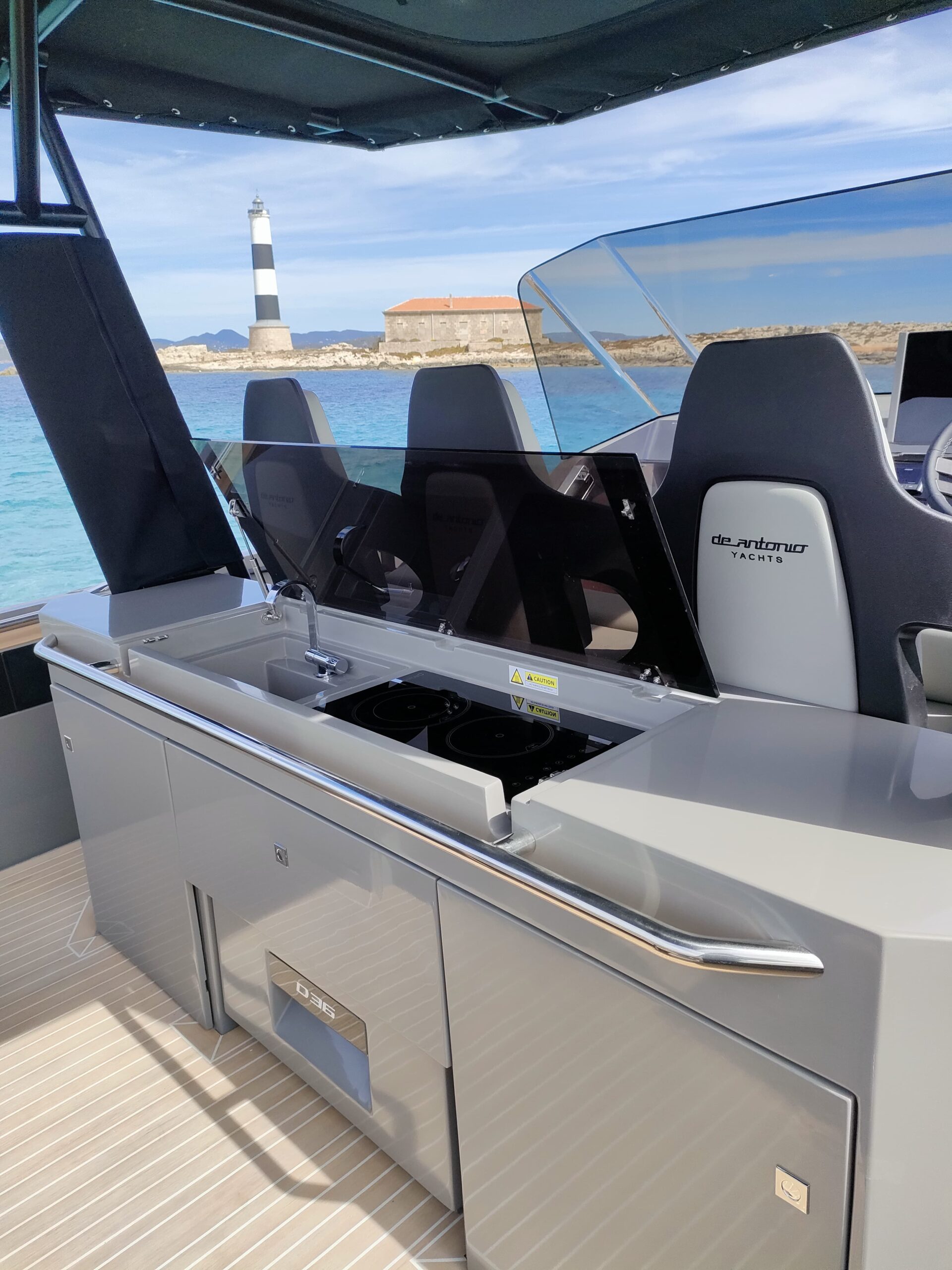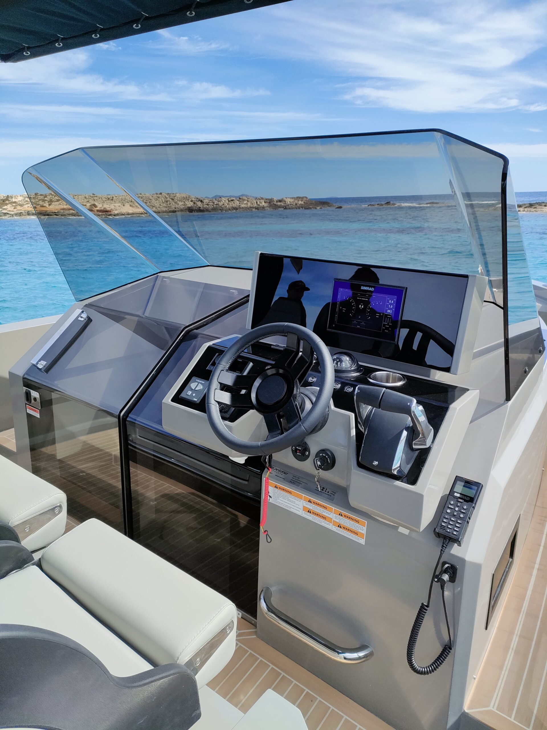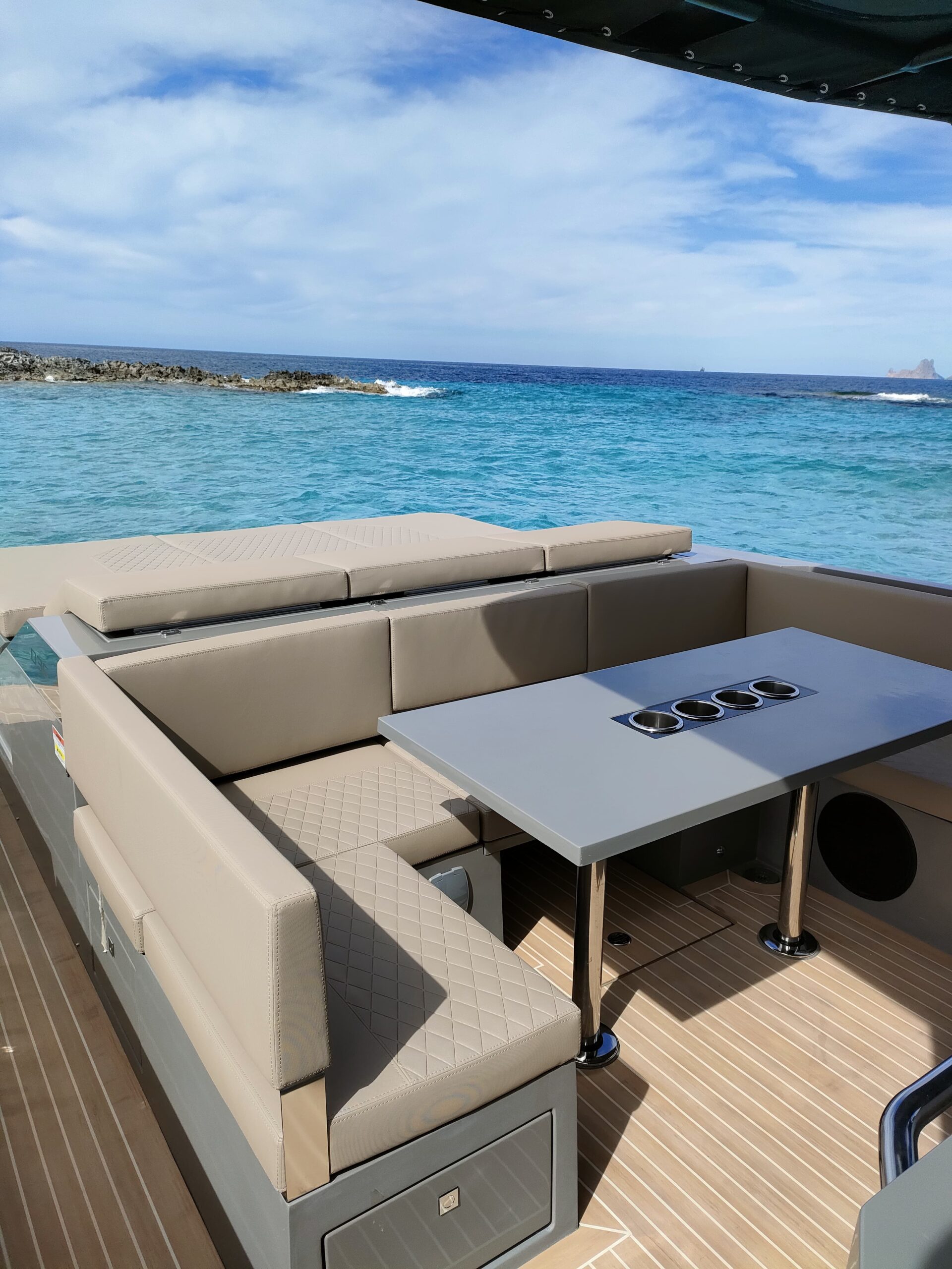 Con una configuración ideal para salidas en grupo, dispone de amplio solárium, ducha en popa, toldo bimini, mesa de cubierta y un potente sistema de sonido Bluetooth. Además, ofrece cabina interior y baño, aportando funcionalidad a una jornada intensa de navegación y relax.