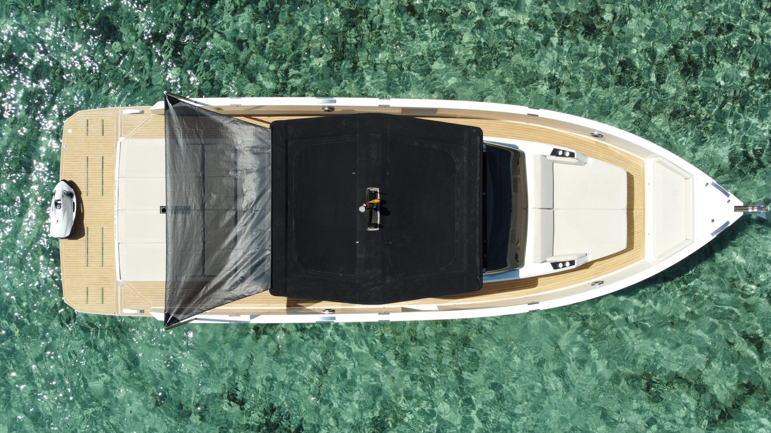 Impulsado por tres motores de 300 hp, este modelo alcanza velocidades superiores a los 40 nudos, garantizando desplazamientos rápidos entre calas. A bordo, el confort es protagonista: solárium, mesa de cubierta, ducha en popa y sistema de sonido Bluetooth crean el ambiente ideal para disfrutar del mar con estilo.